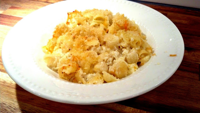 When pasta is done, drain and stir in one tablespoon butter and the garlic. Add cheese sauce to pasta and stir until combined.
